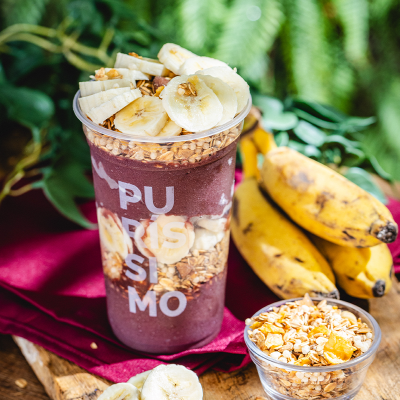 Uma deliciosa mistura de açaí cremoso, bananas maduras e granola crocante em camadas.