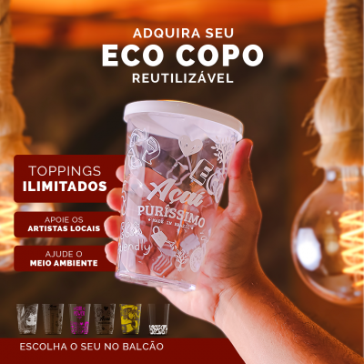 Na compra de um açaí no totem, com o seu EcoCopo você ganha COMPLEMENTOS ILIMITADOS dentro do seu copo.*Não válido para os Toppings Premium e buffet