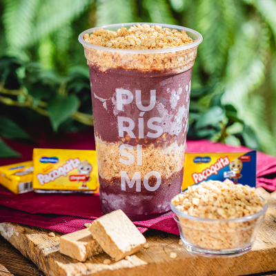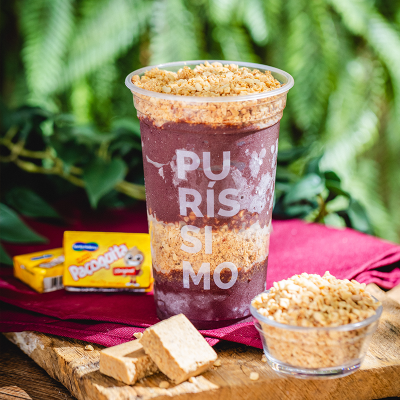 Uma fusão deliciosa do tradicional açaí brasileiro com o sabor inconfundível da paçoquita e amendoim em camadas.