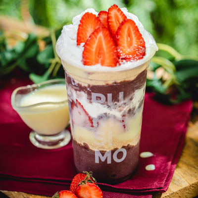 Nossa deliciosa adaptação da torta Monoffee com camadas de açaí, farofa de biscoito, leite condensado, morango e chantilly em camadas!