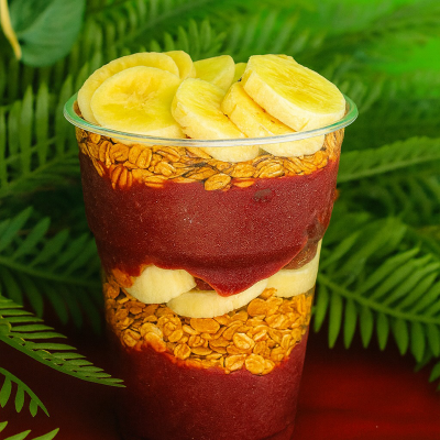 Açaí, banana e granola em camadas