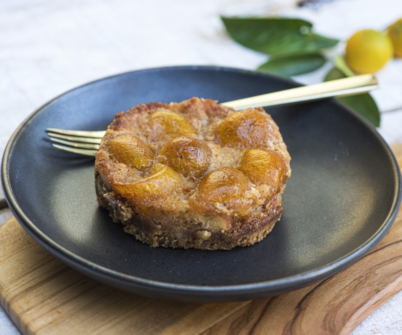 Massa amanteigada sobre crocante de amêndoas e laranjinha kinkan, finalizado com caramel salé.