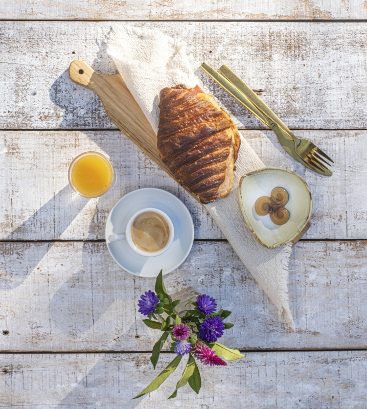 Croissant ou mini baguette, assada com presunto e queijo, shot de suco de laranja e expresso illy.