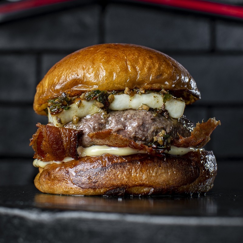 Blend Wagyu Bravo (180g) com queijo coalho, chimichurri caseiro, bacon artesanal e aioli, no pão brioche.