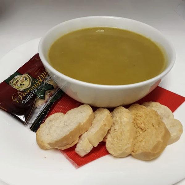 Sopa cremosa de ervilhas, acompanha torradinhas e queijo ralado