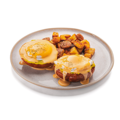 Dois ovos poché servidos sobre pão tipo brioche com molho holandês e abacate. Acompanha porção de batata rústica.