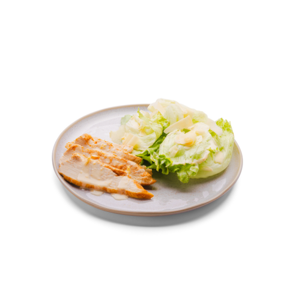 Alface americana, molho caesar, frango grelhado em fatias e queijo parmesão.