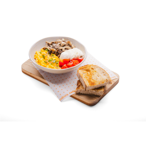 Dois ovos mexidos, mix de cogumelos, mussarela de búfula e tomate cereja. Acompanha pão de fermentação natural e manteiga.