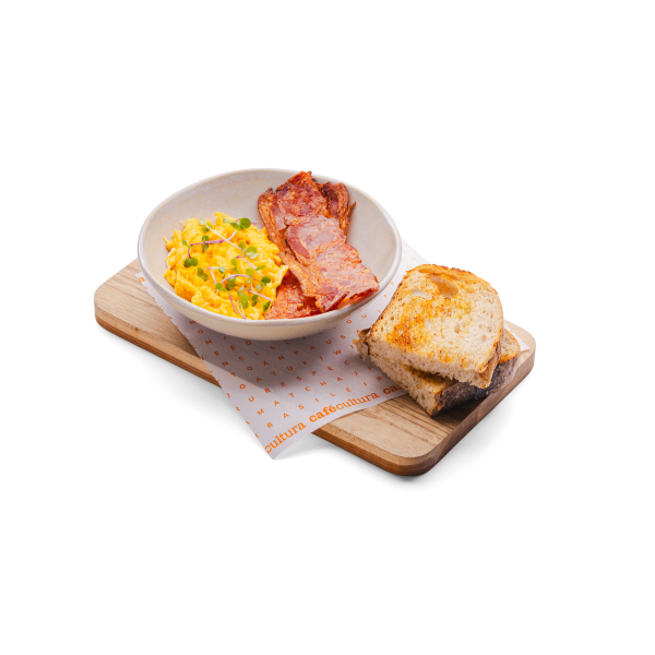 Dois ovos mexidos e bacon. Acompanha pão de fermentação natural e manteiga.