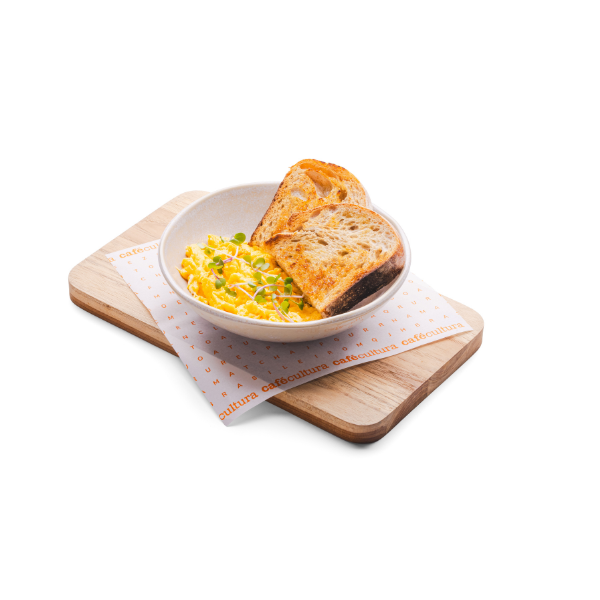 Dois ovos mexidos. Acompanha pão de fermentação natural e manteiga.