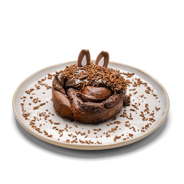 Massa amanteigada, macia e enrolada com chocolate meio amargo. Coberto com calda de brigadeiro e granulado.