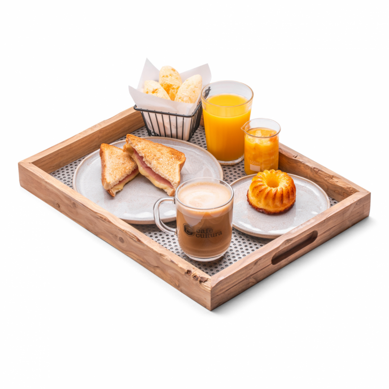 Porção de pão de queijo (3 und), misto quente com queijo mussarela/presunto, bolinho de milho, salada de frutas, suco de laranja integral e café espresso