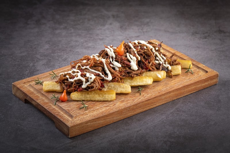150g Saborosa costela bovina desfiada, cuidadosamente preparada e servida sobre sua escolha de uma cama de batata crocante ou um aipim suculento e dourado. Finalizada com um toque especial de molho parmesão cremoso, que traz uma explosão de sabor a cada mordida.