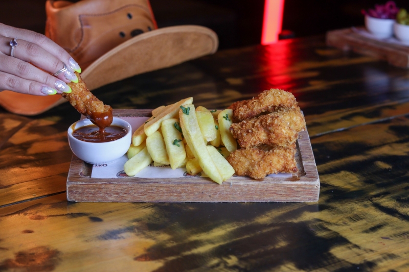 250 gr de tiras de peito de frango temperadas e empanadas na farinha panko. Acompanha batatas fritas e molho barbecue.