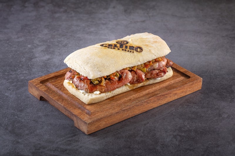 Uma deliciosa linguiça grelhada na brasa, servida com um refrescante vinagrete e o tradicional chimichurri, tudo isso no pão ciabatta de fermentação natural. Acompanha uma porção de batatas fritas crocantes. Uma combinação perfeita de sabores que traz o verdadeiro espírito da parrilla!