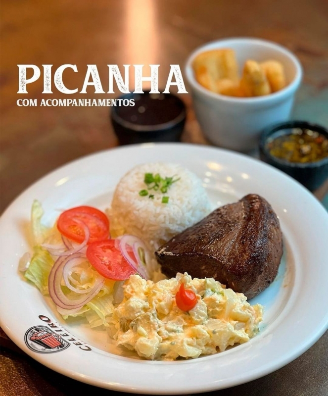 Acompanha arroz, salada, maionese, farofa e batata frita.(aprox. 250grs de carne).OBS.IMAGEM MERAMENTE ILUSTRATIVA