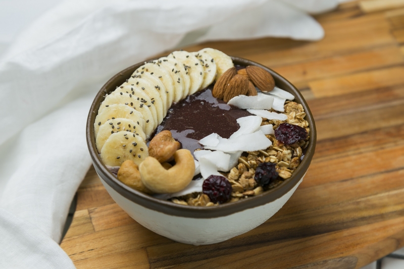 açaí, banana, castanha, coco desidratado em lascas, granola, chia e cranberry