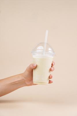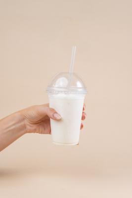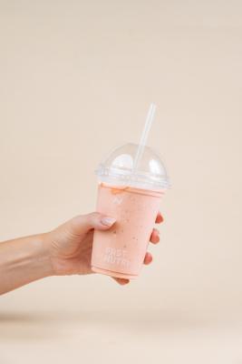 Leite de coco batido com suculentos morangos, creme de leite zero lactose e proteína sabor morango.