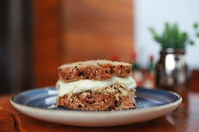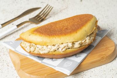 Frango com Mozzarella de búfala. Pão Low Carb artesanal, com farinha de amêndoas, castanha de caju, linhaça dourada e gergelim.