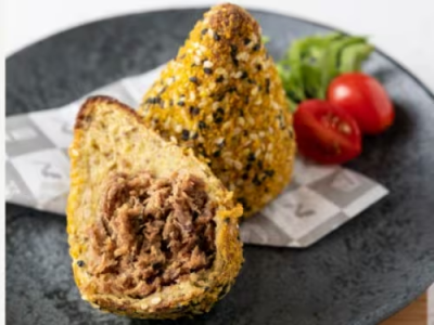 Coxinha assada e empanada na linhaça preta e dourada, com massa de banana da terra e recheada com carne bovina desfiada.