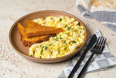 Ovos feitos na manteiga ghee e sal, acompanham fatia de pão sem glúten.