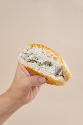 Pão (sem glúten e sem lactose), alcaparras . azeitona preta , atum , cebolinha , Cream cheese sem lactose