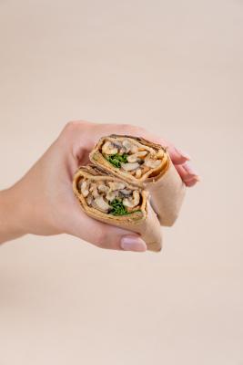 Massa Wrap (fécula de mandioca, leite em pó integral, ovo, espessante), Recheio: Cogumelos, homus, rúcula e nozes ● SEM GLUTEN ●