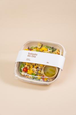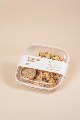 Salmão em lascas, tomate cereja, fusilli SEM GLÚTEN, cebolinha, mix de folhas. Molho de iogurte: Iogurte sem lactose, creme de leite sem lactose, azeite e sal