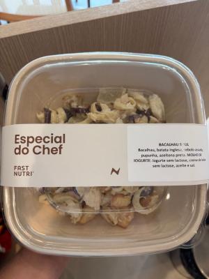 TEMPO DE PREPARO : 15MIN A 20 MIN (Disponível de 11:30 horas até 15:00.horas) Bacalhau, batata inglesa, cebola assadas, pupunha, azeitona pretaMolho de iogurte: Iogurte sem lactose, creme de leite sem lactose, azeite e sal
