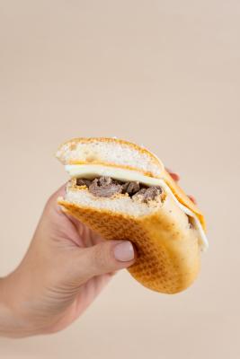 Empanada BY Padoca da Nath ● Choripan: ingredientes principais incluem linguiça de pernil, mix sem glúten para empanada (farinha de arroz, polvilho doce, fécula de batata, farinha de grão de bico, goma xantana e psyllium), água, cebola e mussarela sem lactose, levain sem glúten, azeite, açúcar demerara e sal.