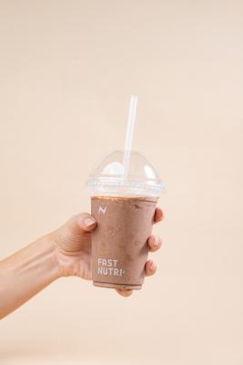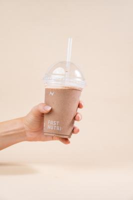Leite de coco batido com proteína de chocolate, paçoca e cacau em pó. (ALERGICOS: CONTEM AMENDOIM E AMENDOAS)