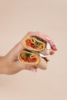 Massa Wrap (fécula de mandioca, leite em pó integral, ovo, espessante), Recheio: Salmão defumado, sour cream, tomate confit e alface ● SEM GLUTEN ●