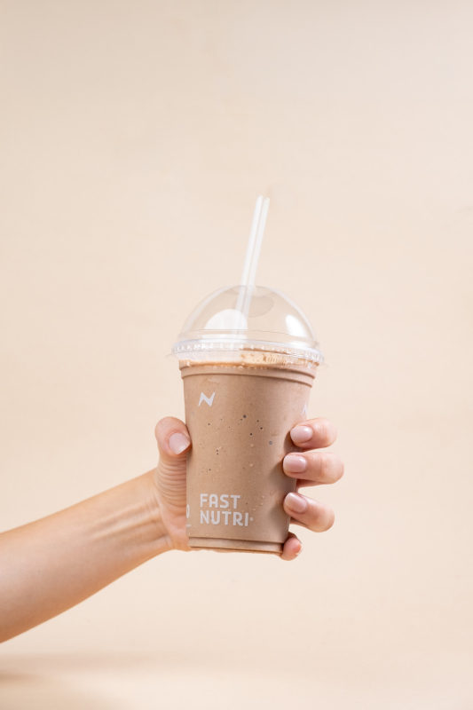 Leite de coco batido com proteína de chocolate, paçoca e cacau em pó. (ALERGICOS: CONTEM AMENDOIM E AMENDOAS)