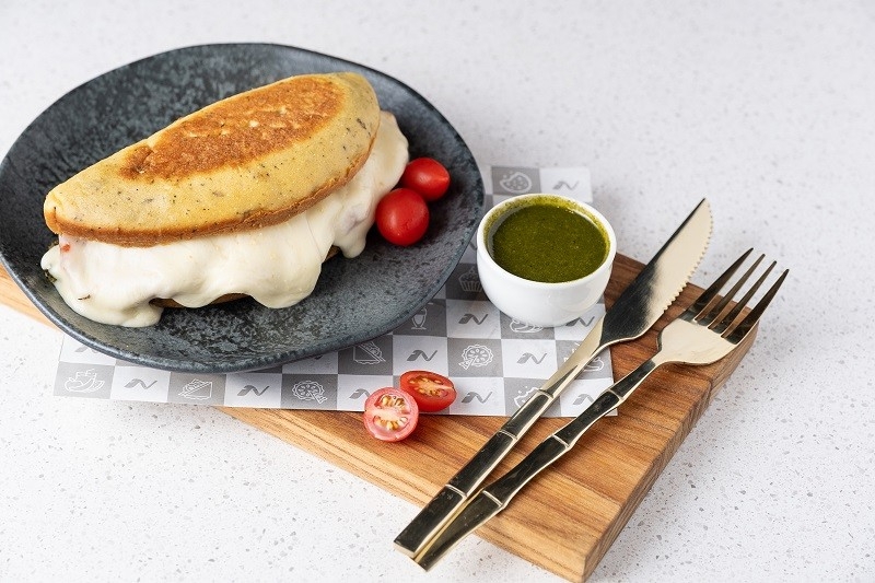 Mozzarella de búfala, tomates fresco artesanal e molho pesto. Massa low carb com farinha de amêndoas, farinha de grão de bico, azeite e ovos.