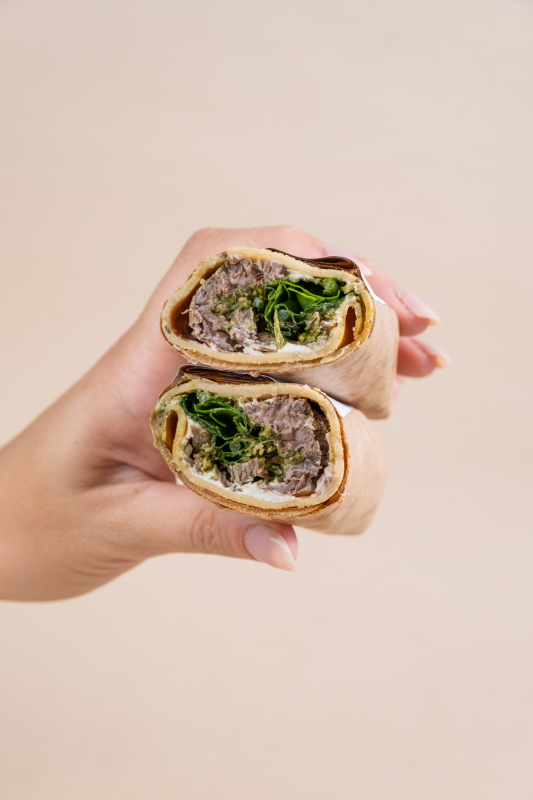 Massa Wrap (fécula de mandioca, leite em pó integral, ovo, espessante), Recheio: Roast beef, cream cheese sem lactose, rúcula, tomate e molho pesto ● SEM GLUTEN ●