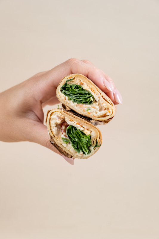 Massa Wrap (fécula de mandioca, leite em pó integral, ovo, espessante), Recheio: Frango desfiado, cenoura, tomate, iogurte integral sem lactose e alface ● SEM GLUTEN ●