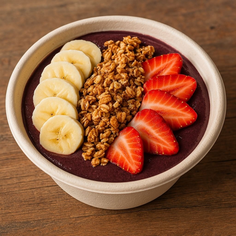SEM GLUTEN / SEM LACTOSE / VEGANO / SEM XAROPES e SEM CONSERVANTES Açaí Puro sem açúcar batido com néctar de tâmara e banana Topping: granola, morango, banana e chia.
