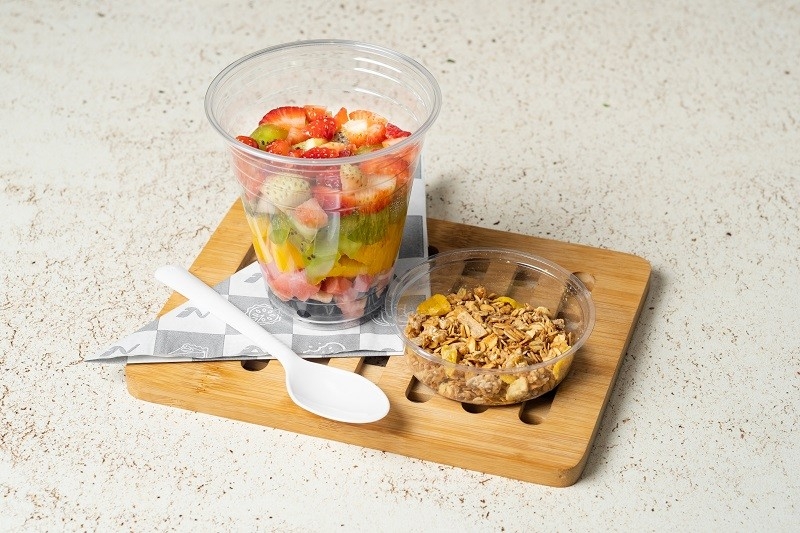Morango, uva, kiwi, goiaba, manga com granola sem açúcar.