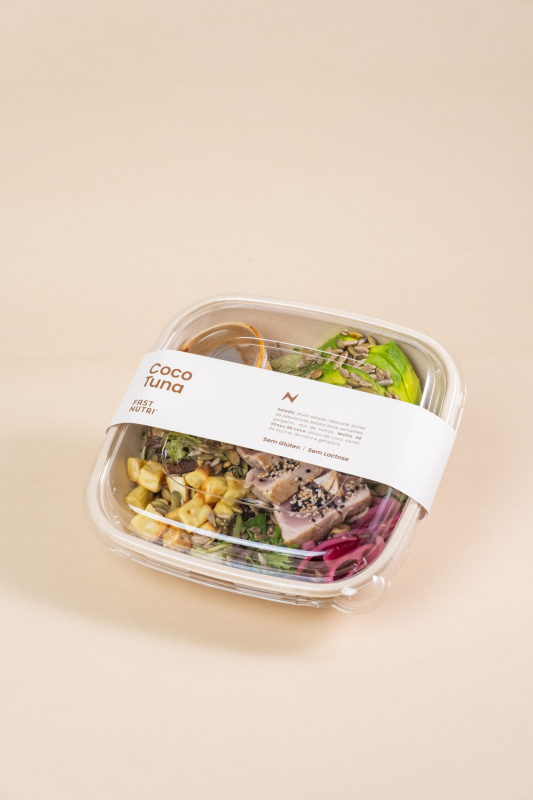 Atum selado, abacate, picles de cebola roxa, batata doce, sementes, gergelim, mix defolhas. Molho de shoyu de coco: Shoyu de coco, calda de açúcar de coco e gengibre