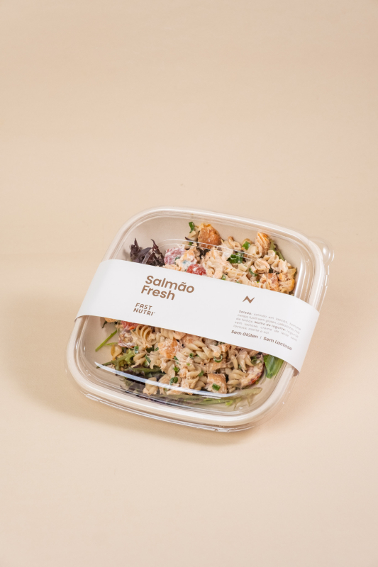 Salmão em lascas, tomate cereja, fusilli SEM GLÚTEN, cebolinha, mix de folhas. Molho de iogurte: Iogurte sem lactose, creme de leite sem lactose, azeite e sal
