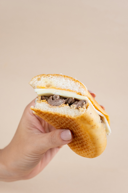 Pão (sem glúten e sem lactose), molho tomate artesanal , file mignon, mussarela de búfala.