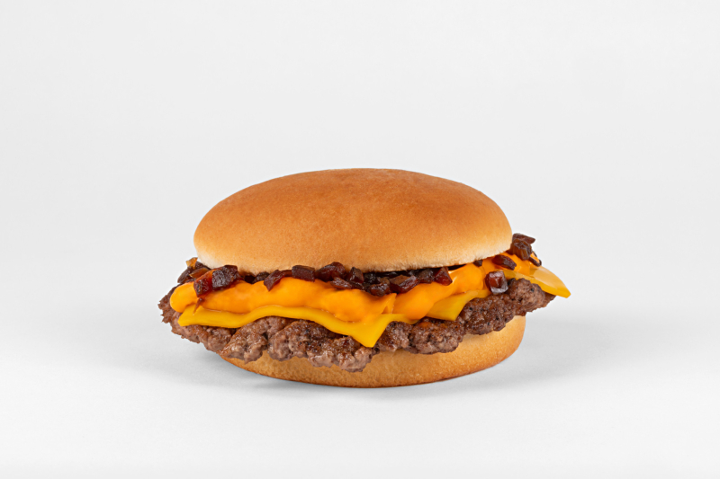 CARNE, BASTANTE CHEDDAR CREMOSO, CEBOLA AO MOLHO SHOYO E UM PÃO ESCURO COM GERGELIM.
