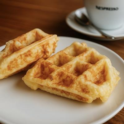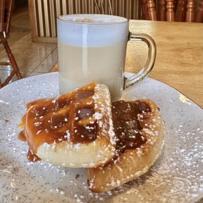 2 quadradinhos de waffles com cobertura de caramelo real com café expresso.