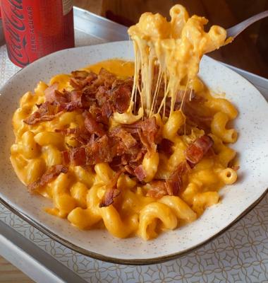 Para amantes de macarrão com queijo, temos uma deliciosa massa com creme de queijo cheddar e muçarela derretido, finalizado com bacon picadinho.