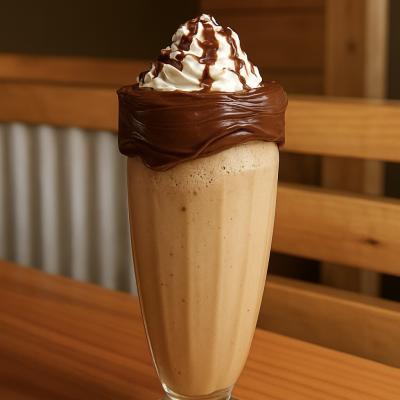 Milkshake batido com café expresso e delicioso sorvete de baunilha, taça decorada com borda de Nutella, chantilly e calda de chocolate.
