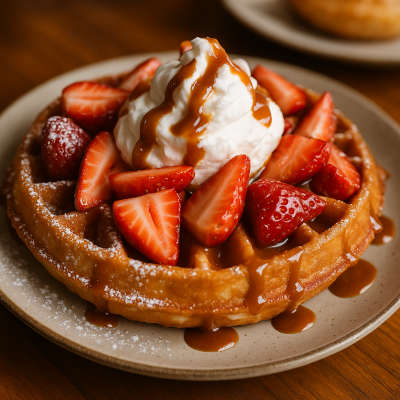 Delicioso Waffle coberto com caramelo real, com chantilly de baunilha e morangos frescos.
