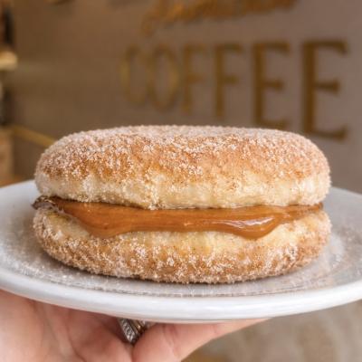 Gostinho de infância, donut com açúcar e canela e recheado com nosso incomparável doce de leite.