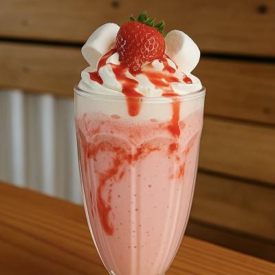 Sorvete de morango batido com leite, decorado com chantilly, calda de morango, marshmellow e morango.