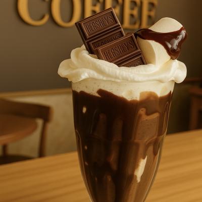 Decorado com chocolate hershey´ s, chantilly, leite batido com sorvete de chocolate, finalizado com calda de chocolate e marshmellow.