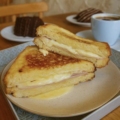 Sanduíche Monte Cristo é feito com três fatias de pão brioche com fatias de peito de peru e queijo muçarela derretido e passado em um mix com leite e tostado na manteiga.